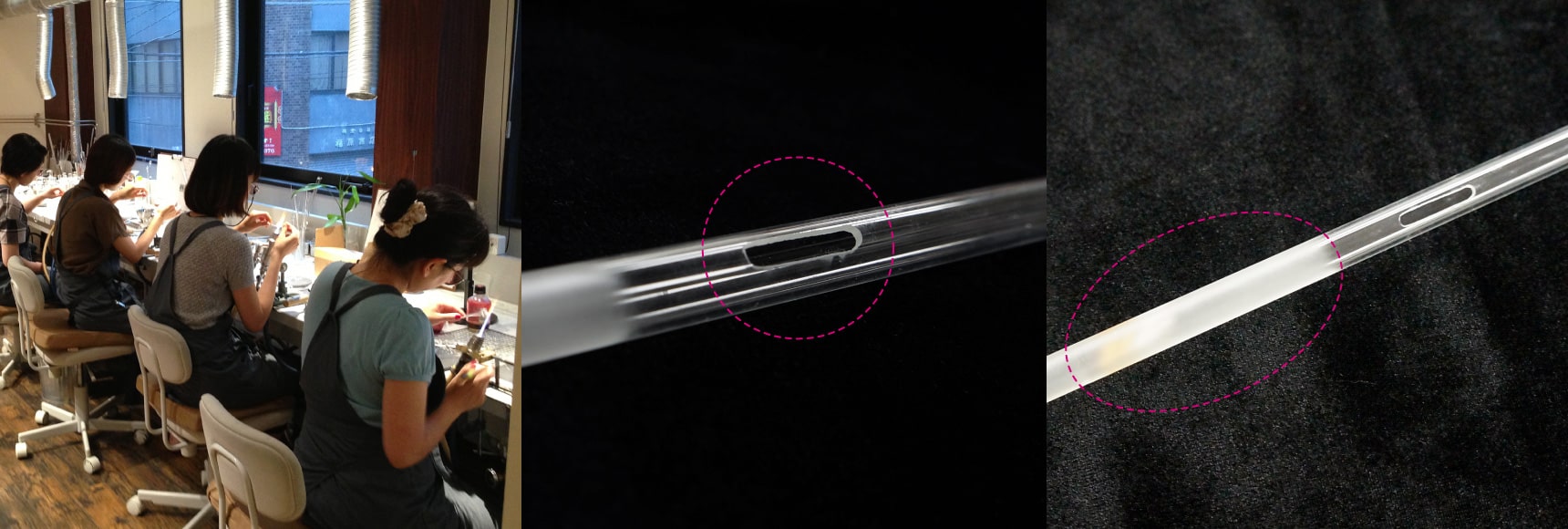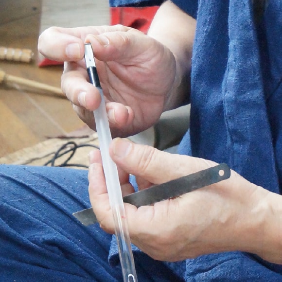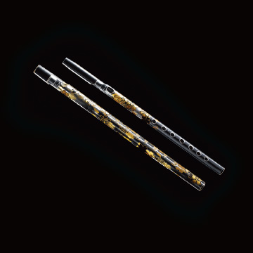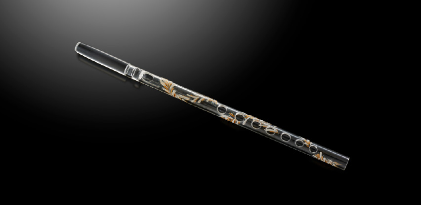 We created a glass shakuhachi with the goal of honing and passing on our finest glass craftsmanship. This crystallization of quality workmanship was handmade by eleven skilled artisans over a period of three months using traditional techniques. Made of heatproof glass, the glass shakuhachi is lighter than a wooden shakuhachi and maintains a stable pitch regardless of temperature. Craftsmen under the supervision of a player also carefully adjusted the shape of the cylinder, size of the finger holes and angle of the mouthpiece. The glass creates a unique sound, but we made sure it reproduces the depth of sound of a wooden shakuhachi.