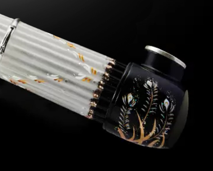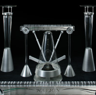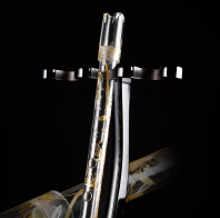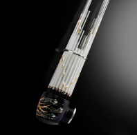 Production of the glass sho involved 40 people and was supervised by Hideki Togi, a renowned Japanese classical musician. The instrument is the same size as a traditional bamboo sho, but creates a somewhat different sound due to its glass construction. An LED was added to express the concept of light coming from heaven.- Weight: