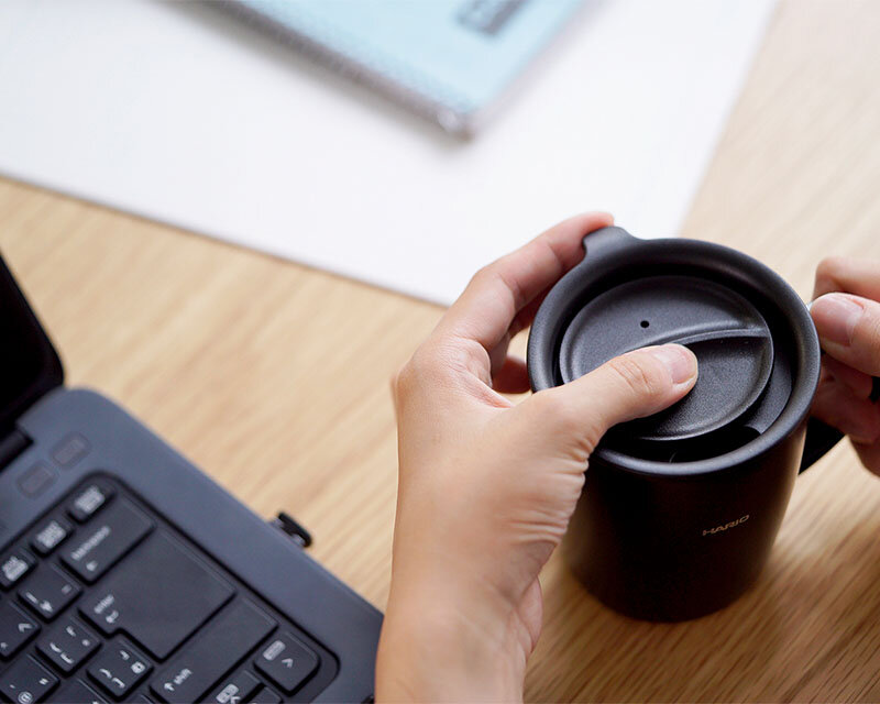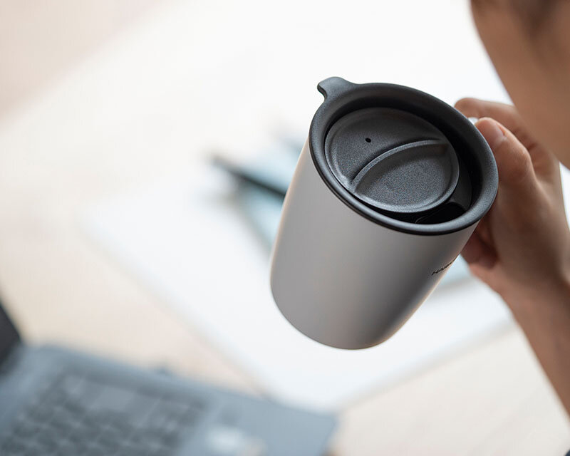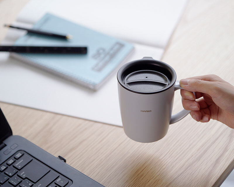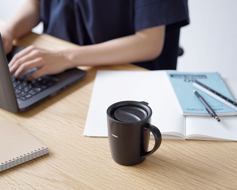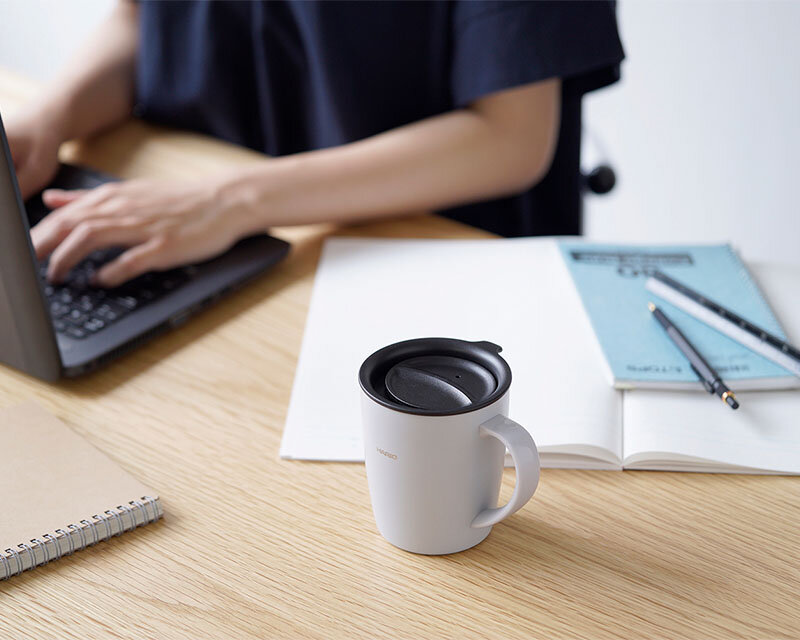Insulated mug with lid, 300mL capacity.